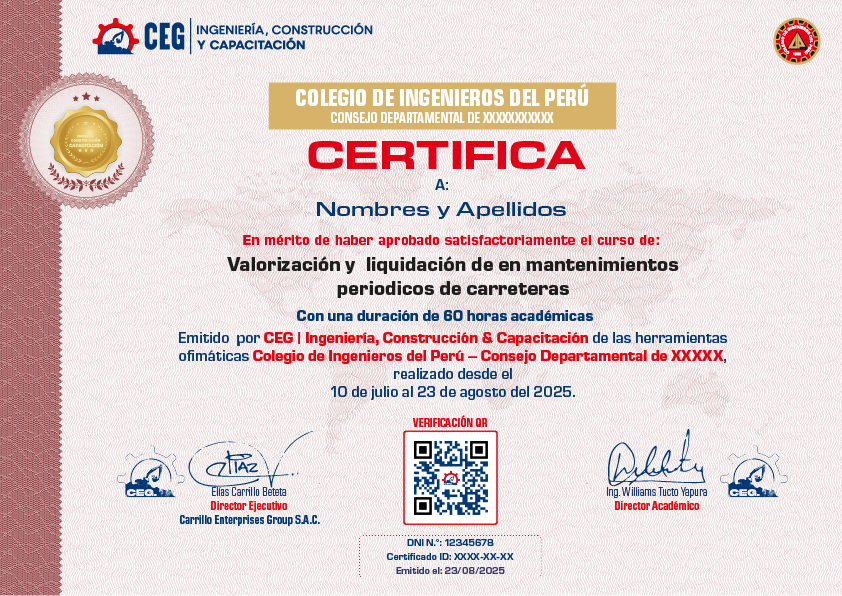Tenemos un covenio en proceso con el Colegio de Ingenieros del Perú, lo que otorgará un mayor respaldo y validez a este curso. El certificado será opcional, y para obtenerlo, solo deberás agregar al costo del curso de tu elección un valor adicional de S/ 35 al momento de realizar la inscripción a través de la pasarela de pagos.